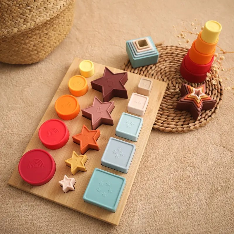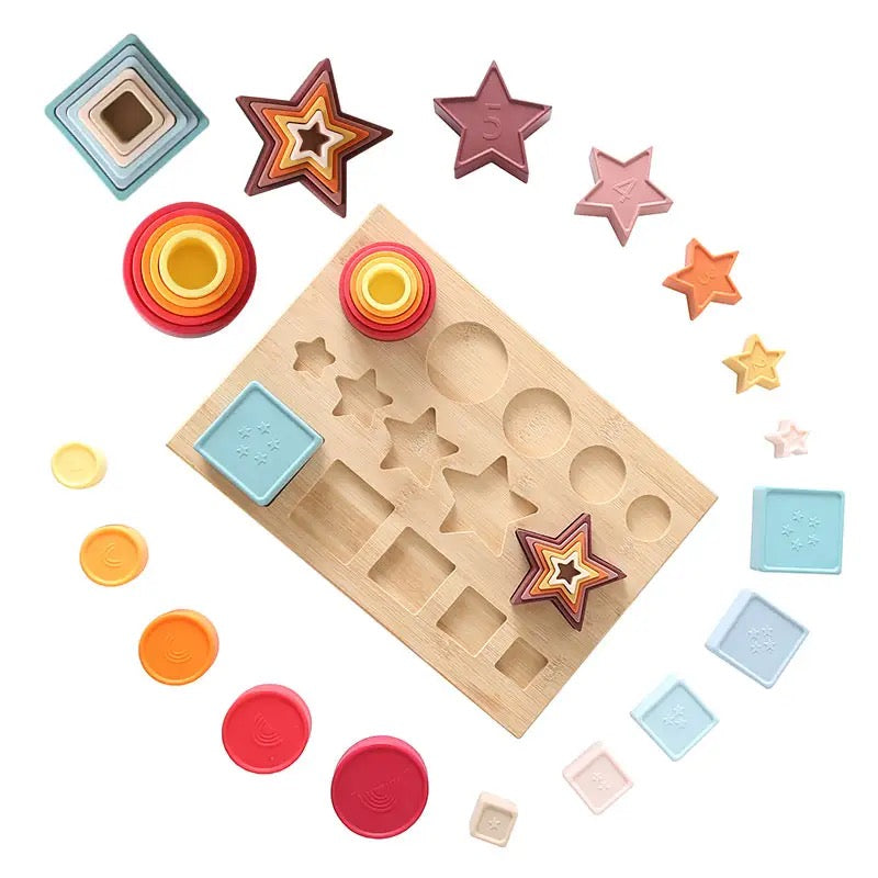 - Multi-Functional Design: Features a variety of shapes, including stars, circles, and squares, along with matching slots for sorting and stacking.