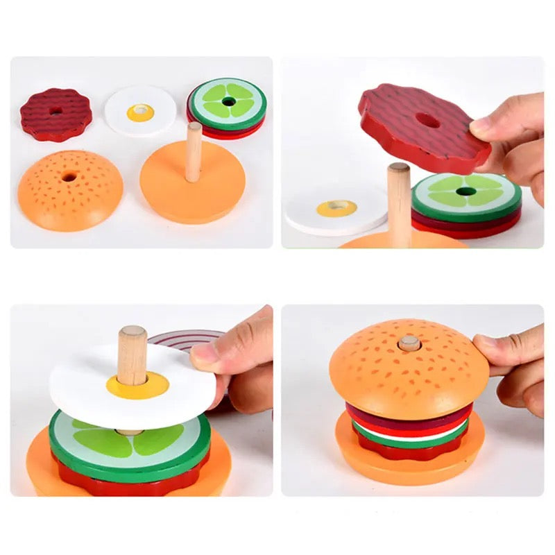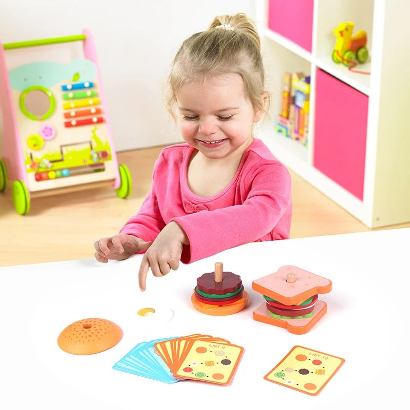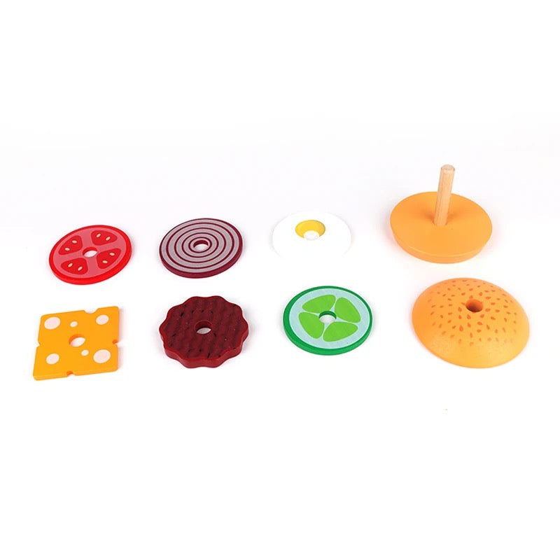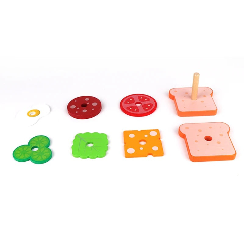 Unleash your child's creativity and fine motor skills with the Stack 'n Serve Builder! This fun and educational wooden toy set allows kids to create their own delicious burger or sandwich combinations by stacking colorful and realistic wooden food pieces. The set includes a variety of ingredients (8 pieces), all designed to fit perfectly on a sturdy wooden peg.