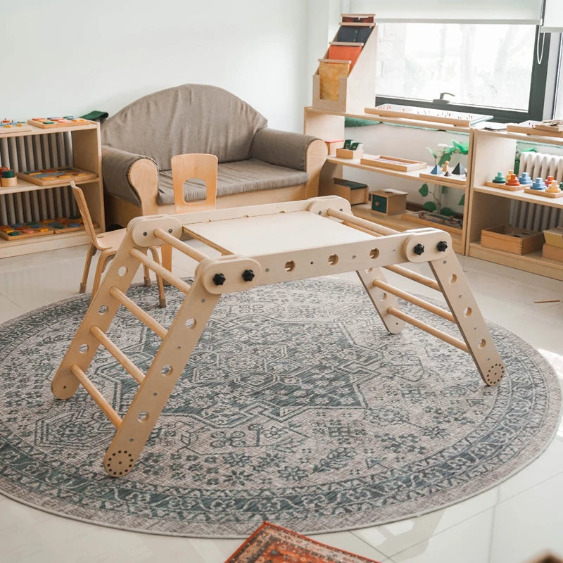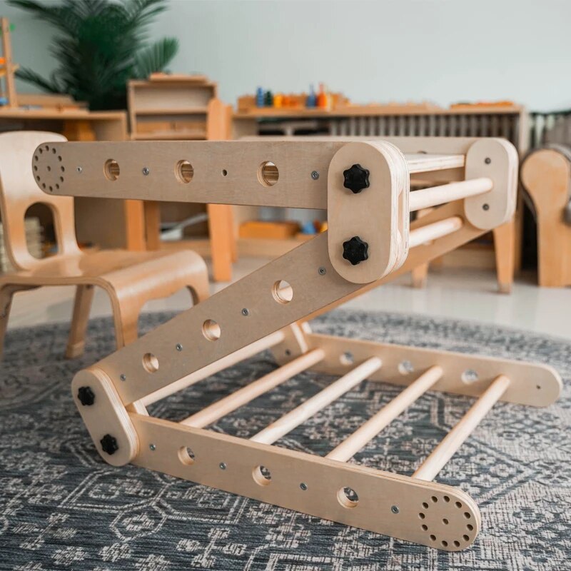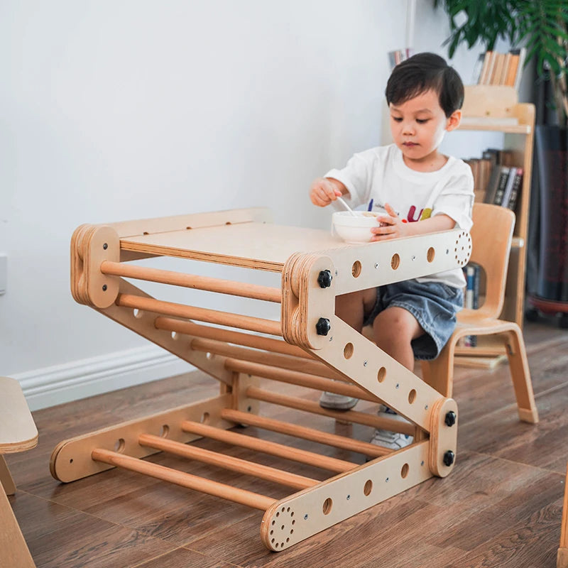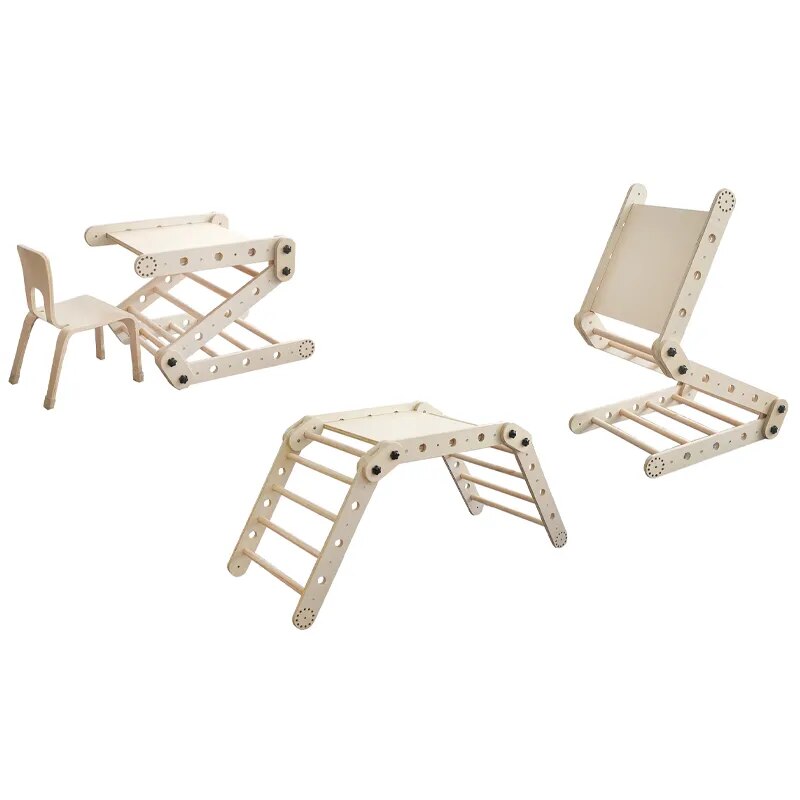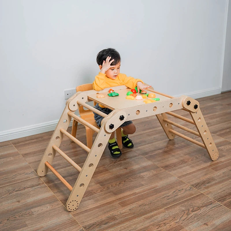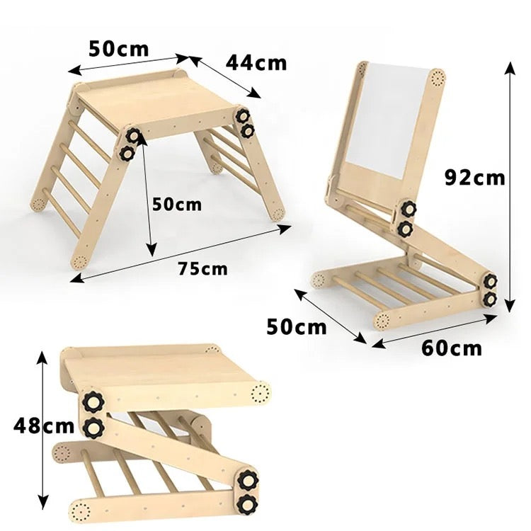 Foldable Triangle Climber 3-in-1 can be changed into different shapes and heights by adjusting the screws (takes about 8 minutes), it opens up more possibilities and is suitable for children of different ages. In addition, this wooden toy can be easily transformed into a children's play table. It can also become a folding easel.