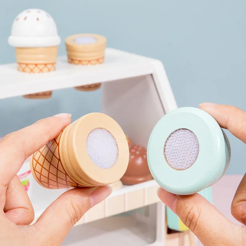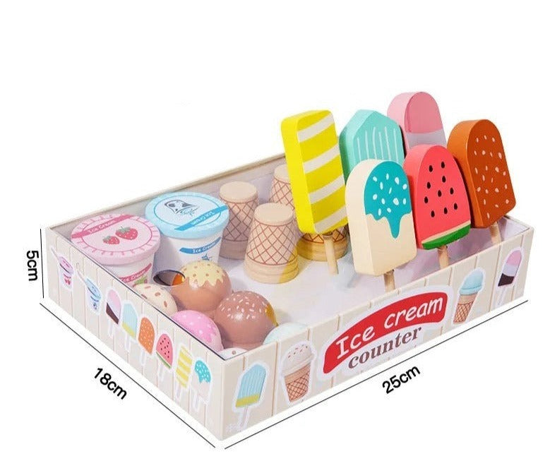 Delight your child with the imaginative world of the Ice Cream Counter Playset. This beautifully crafted wooden playset is perfect for enhancing social skills, hand-eye coordination, and creative thinking. With a variety of ice cream scoops, cones, and popsicles, this toy offers endless fun and learning opportunities.