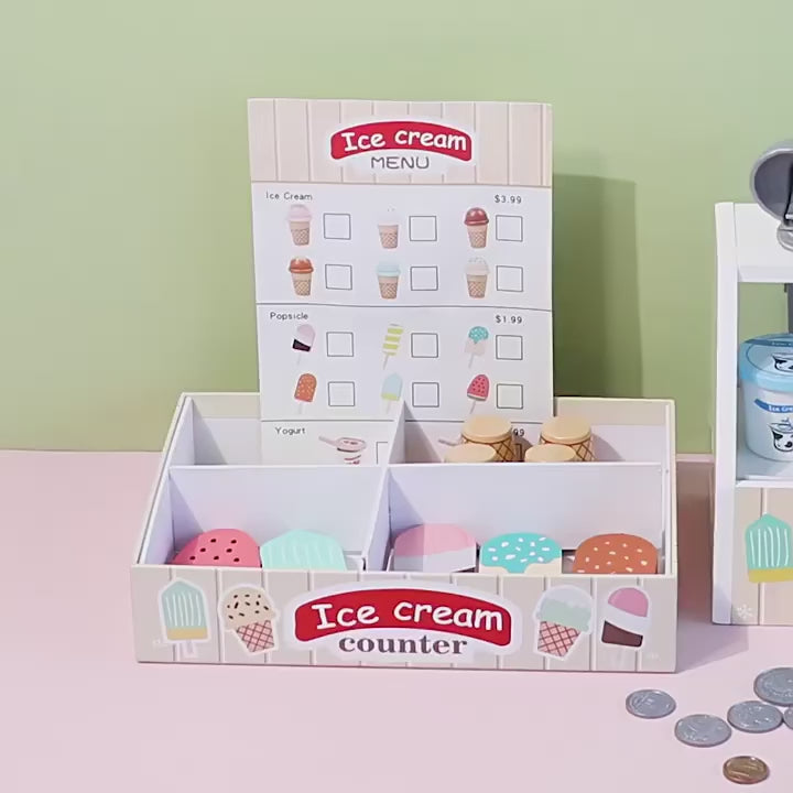 - Contains: 1x Ice cream display stand, 2x ice cream cups, 6x ice cream cones, 6x popsicles, 6x ice cream scoops, 2x wooden spoons, ice cream scooper, play money (coins and banknotes), menu card