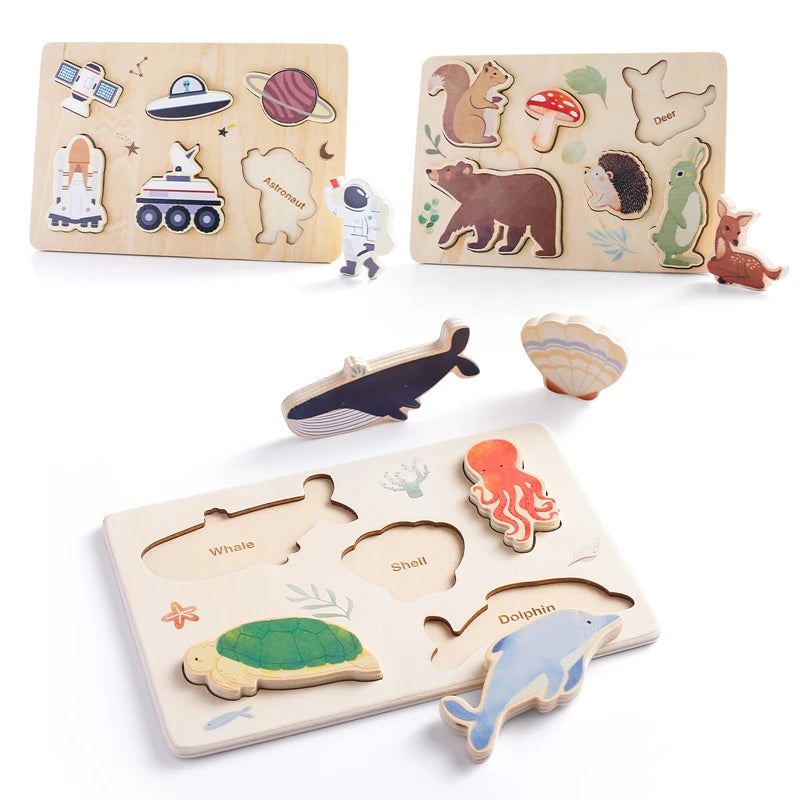 Introduce your little ones to the magical realms of space, forest, and ocean with the Whimsical World Shape Puzzles. These engaging puzzles are designed to enhance your child's cognitive and motor skills while sparking their imagination. Each puzzle features beautifully illustrated, high-quality wooden pieces that fit perfectly into their respective slots on the board.