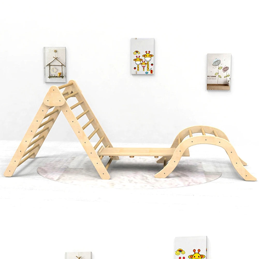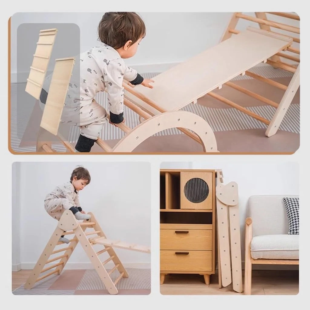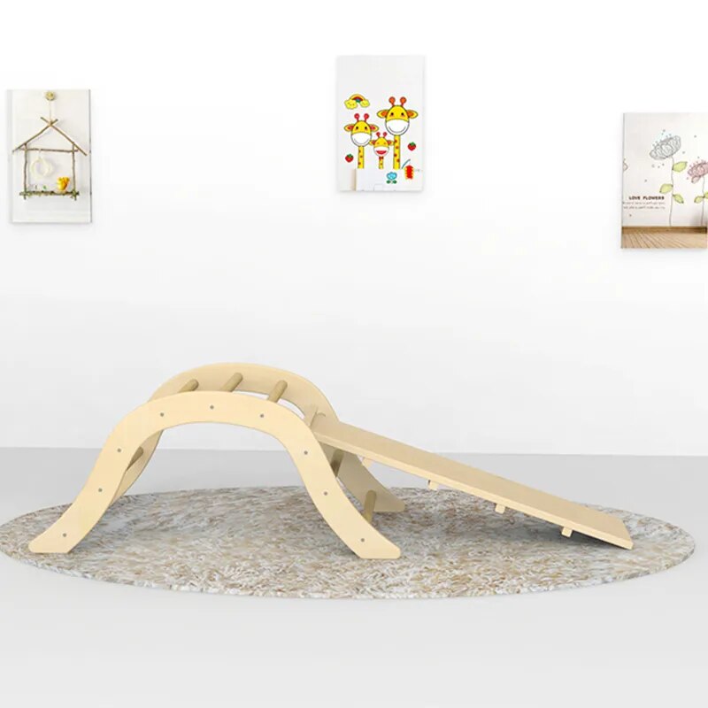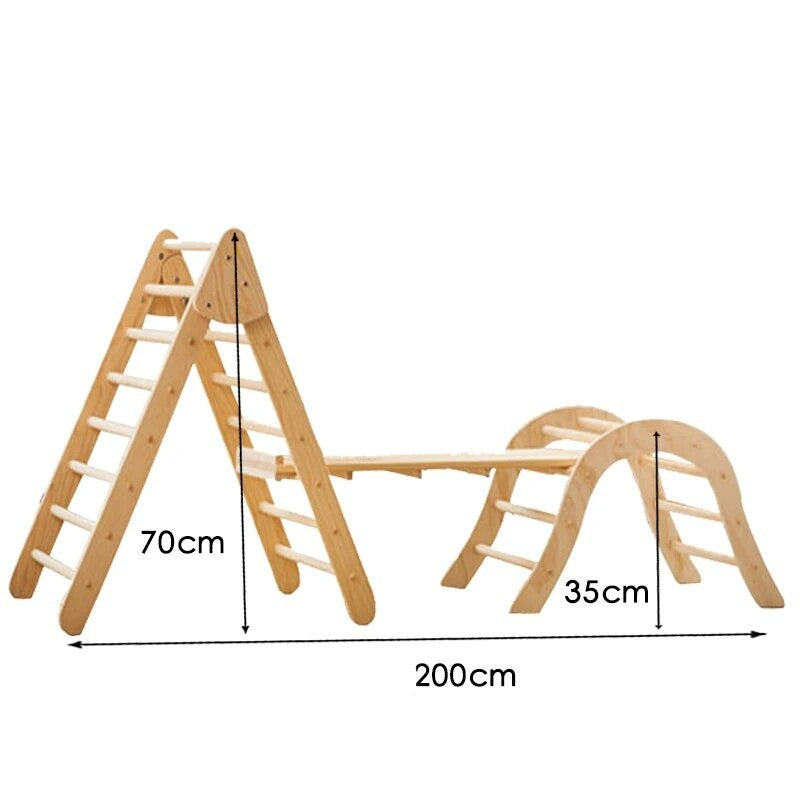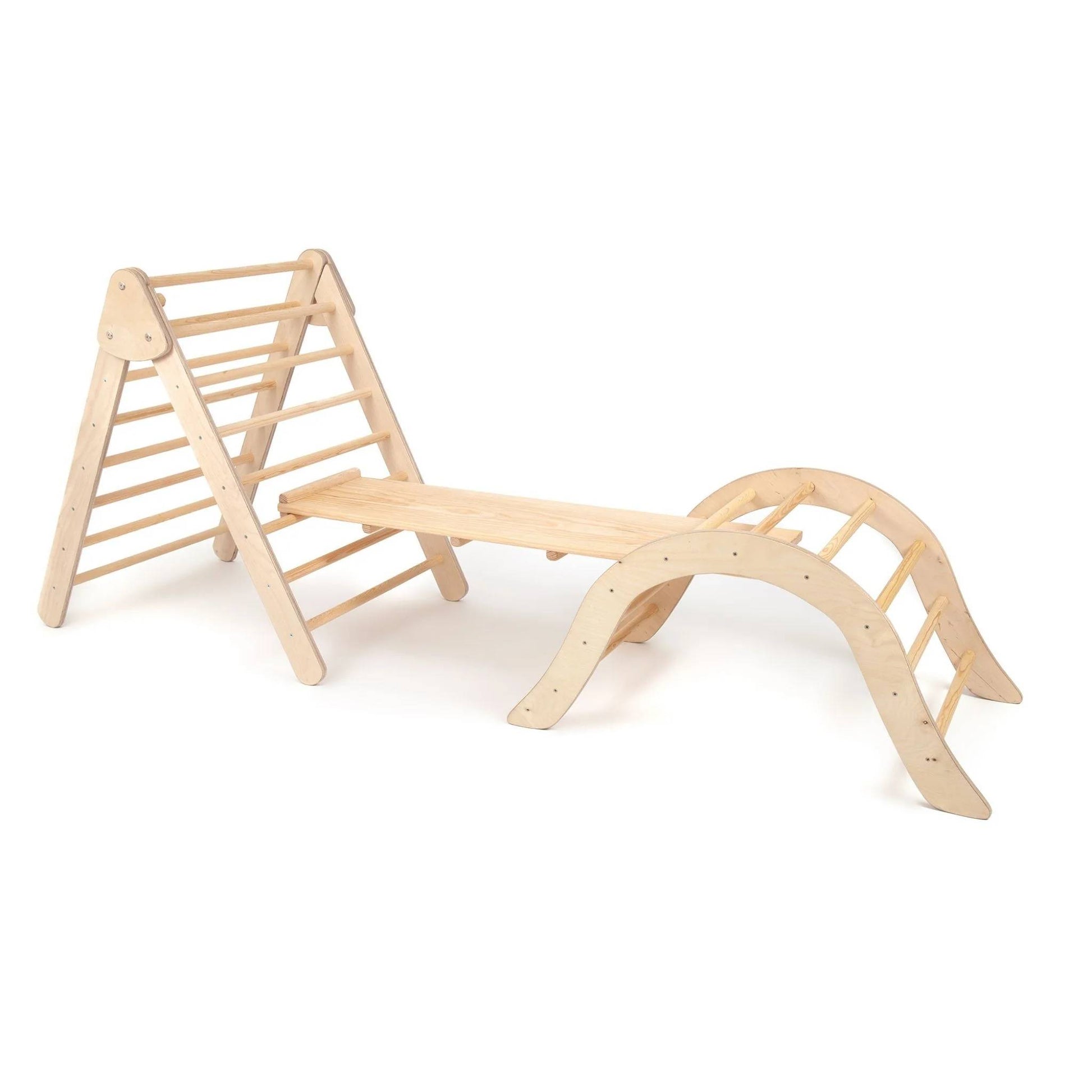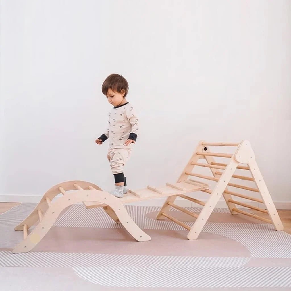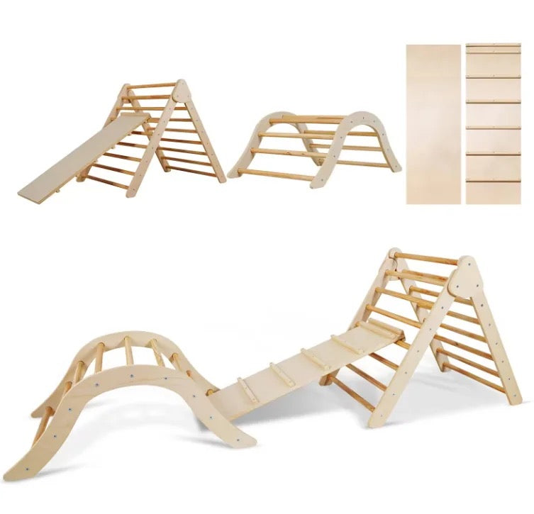 This combination of climbing triangle and ramp with connectable arch encourages open-ended collaborative play amongst pairs and groups of children. Its simplistic design gives kids a chance to let their imaginations run wild. Order now and create your own adventure playground! When not in use the the set has a warm, lovely presence in any room. Each piece is handmade with care and love from sustainable wood. It also helps develop gross motor skills, physical strength, and agility, encouraging free movement and free play. Can be used for Montessori Method.